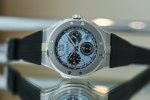 Das Zifferblatt des Alpine Eagle XL Chrono ist ein Beweis für Chopards Liebe zum Detail und thematische Konsistenz. Seine Textur ist von der Iris eines Adlerauges inspiriert, eine Designentscheidung, die die alpine Inspiration der Kollektion unterstreicht. Der tiefblaue Farbton des Zifferblatts kontrastiert wunderschön mit dem Roségoldgehäuse und erzeugt eine beeindruckende visuelle Harmonie. Die Hilfszifferblätter bei 3, 6 und 9 Uhr bieten ein ausgewogenes Layout, das die Lesbarkeit erleichtert und gleichzeitig die ästhetische Integrität des Zifferblatts bewahrt.