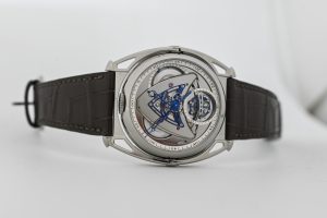 Funktionen: Doppelte Anzeige von Stunden und Minuten auf Vorder- und Rückseite, springende Sekunden, ultraleichtes 30-Zoll-Tourbillon von De Bethune aus Titan, sphärische Mondphasenanzeige, Schaltjahresanzeige, ewiger Kalender mit Tag-, Monats- und Datumsanzeige, Anzeige des Endes der Gangreserve, Anzeige des Mondalters