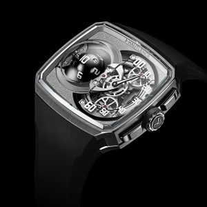 Das Gehäuse der Sphere Series 2 ist ein atemberaubendes Kunstwerk mit einer geometrischen Silhouette, die mit Winkeln und Kurven spielt, um ein Gefühl von Gleichgewicht und Harmonie zu erzeugen. Das aus leichtem Titan gefertigte Gehäuse verfügt über eine Kombination aus polierten und gebürsteten Oberflächen, die ein dynamisches Zusammenspiel von Licht und Schatten erzeugen. Die Verwendung von Titan verbessert nicht nur die Optik der Uhr, sondern sorgt auch dafür, dass sie trotz ihrer beachtlichen Größe leicht und bequem am Handgelenk bleibt.
