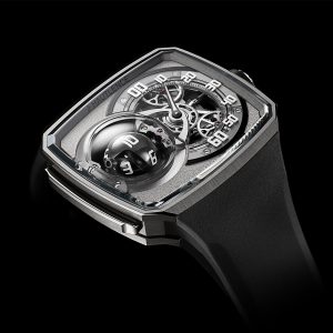 Die Hautlence Sphere Series 2 wird an einem schwarzen Gummiband getragen, das mit einer Dornschließe geschlossen wird. Die Marke wird nur 28 Exemplare herstellen und der Preis beträgt 69.000 CHF.