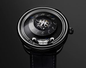 Das Zifferblatt wird von einem dreiachsigen Tourbillon mit einem Titankäfig dominiert, der das verschlungene Doppel-H-Logo von Hermès in Form bringt. Dieses Motiv stammt von der Schmiedearbeit, die den Aufzug in der ursprünglichen Pariser Boutique in der Rue du Faubourg-Saint-Honoré 24 schmückte und die Verbindung von Émile Hermès und Julie Hollande im Jahr 1990 symbolisierte. Der optisch beeindruckende Käfig ist hochglanzpoliert und dreht sich in 25 Sekunden einmal um die eigene Achse. Er ist in einem zweiten Käfig untergebracht, der sich in 60 Sekunden dreht und sich in einem Winkel von 90° zum ersten Käfig dreht. Beide sind dann in einem dritten Käfig untergebracht, der sich in 100 Sekunden auf der vertikalen Ebene einmal um die eigene Achse dreht.