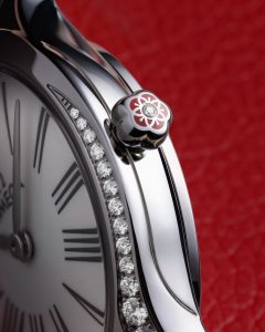 Wenn Sie diese Uhren umdrehen, ist das bekannte „Her Time“-Muster der Marke auf den Gehäuseboden gedruckt – ein blühendes Blumenmandala, das als eine Art Hommage an die Geschichte der Damenuhrmacherei der Marke dient, die bis ins späte 19. Jahrhundert zurückreicht. In Anlehnung an das Blumenmotiv ist die Krone selbst mit einer leuchtend roten Blume bedruckt und in der Mitte mit einem einzelnen Diamanten besetzt. Darüber hinaus weist die Marke darauf hin, dass jedes Modell mit einem einzigartigen Armband aus ihrer eigenen Schmuckkollektion kombiniert wird. Angesichts der Tatsache, dass wir hier fest im Bereich der Schmuckuhren verankert sind, ist es meiner Meinung nach keine Überraschung (seufz), dass jede dieser Uhren von einem der Quarzwerke der Marke angetrieben wird – genauer gesagt vom Kaliber Omega 4061.