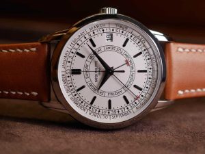 Das Zifferblatt funktioniert unter anderem deshalb so gut, weil sich alle Zeiger um das zentrale Ritzel drehen, die Konsistenz zwischen Zeigern und Indizes sowie das Design der Zeiger selbst. Der Mittelpunkt reduziert jegliche visuelle Unordnung und die beiden unterschiedlichen Zeigerdesigns machen ihre Funktionen klar; Dauphine-Zeiger aus geschwärztem Weißgold für die Uhrzeit und Hammerzeiger mit roter Spitze für den Wochentag und die Wochennummer. Die Zeiger haben zwei geläppte Facetten, ebenfalls aus geschwärztem Weißgold, während die passenden Indizes vier Facetten aufweisen.