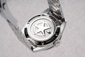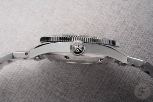 Die Gehäusearchitektur zeichnet sich durch scharfe, moderne Kanten aus, die durch ein facettiertes Edelstahlarmband harmonisch harmonieren und eine stimmige, moderne Ästhetik schaffen. Besonders hervorzuheben ist die Lünette mit 120 Klicks und einem einseitig drehbaren Design mit einem hochglanzpolierten schwarzen Keramikeinsatz, der durch tief eingravierte Markierungen veredelt und großzügig mit Super-LumiNova gefüllt ist.