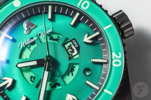 Die William Wood Triumph ist jetzt 3 Jahre alt, und daher dachte ich, ich könnte einen Teil dieser Rezension nutzen, um Vorschläge zu machen, wie sie sich für eine zweite Generation weiterentwickeln könnte. Obwohl ich das Gesamtbild gleich lassen würde, würde ich gerne eine dünnere Ausführung sehen, selbst wenn das bedeutet, dass ich etwas vom Gehäuseboden und Rotordesign opfern müsste. Ich denke, es wäre absolut genial, wenn die Lünette komplett aus Messing wäre, um zu den Drückern zu passen, und wenn sie geätzte Markierungen hätte, möglicherweise mit Schwarz gefüllt. Am Zifferblatt wären die einzigen beiden Änderungen, die ich vornehmen würde, das Datumsfenster mit einem polierten goldfarbenen Rahmen zu versehen und den Zeigern eine Art Charakter zu verleihen, selbst wenn es nur eine Abschrägung wäre. So wie sie ist, ist die Triumph ein hervorragendes Beispiel für eine Themenuhr, wie die meisten Modelle der Marke. Obwohl sie am Handgelenk eine große Größe hat, hat mir die Größe der Uhr im Alltag nie die Freude daran verdorben, und ich denke auch nicht, dass eines der Elemente, das für die nächste Generation geändert werden könnte, beeinträchtigt hätte. Der William Wood Triumph-Chronograph ist wahlweise mit einem Feuerwehrarmband oder einem Edelstahlarmband erhältlich und kostet 2.520 GBP.